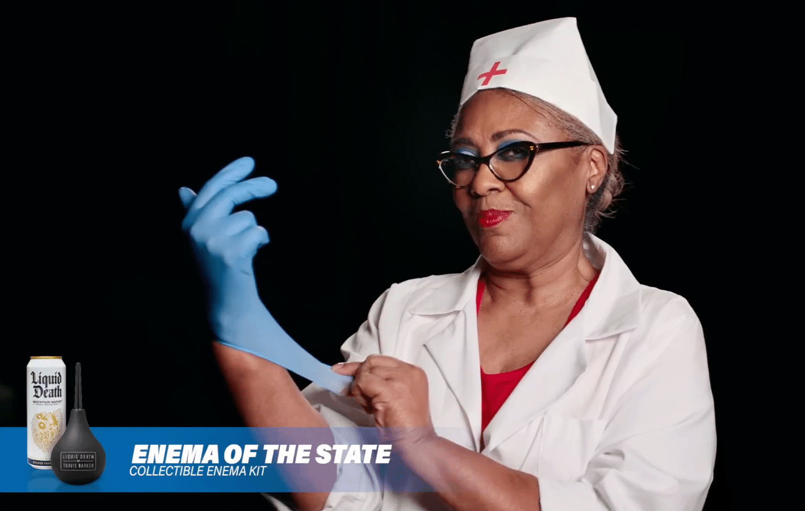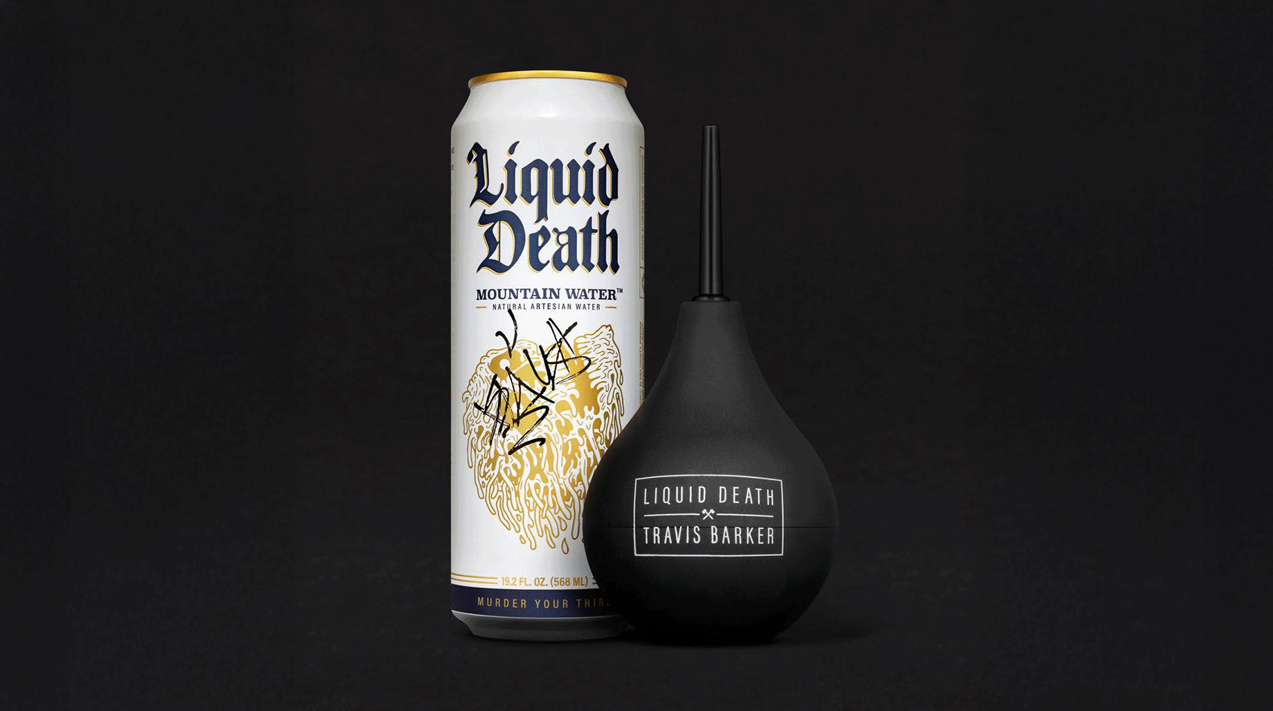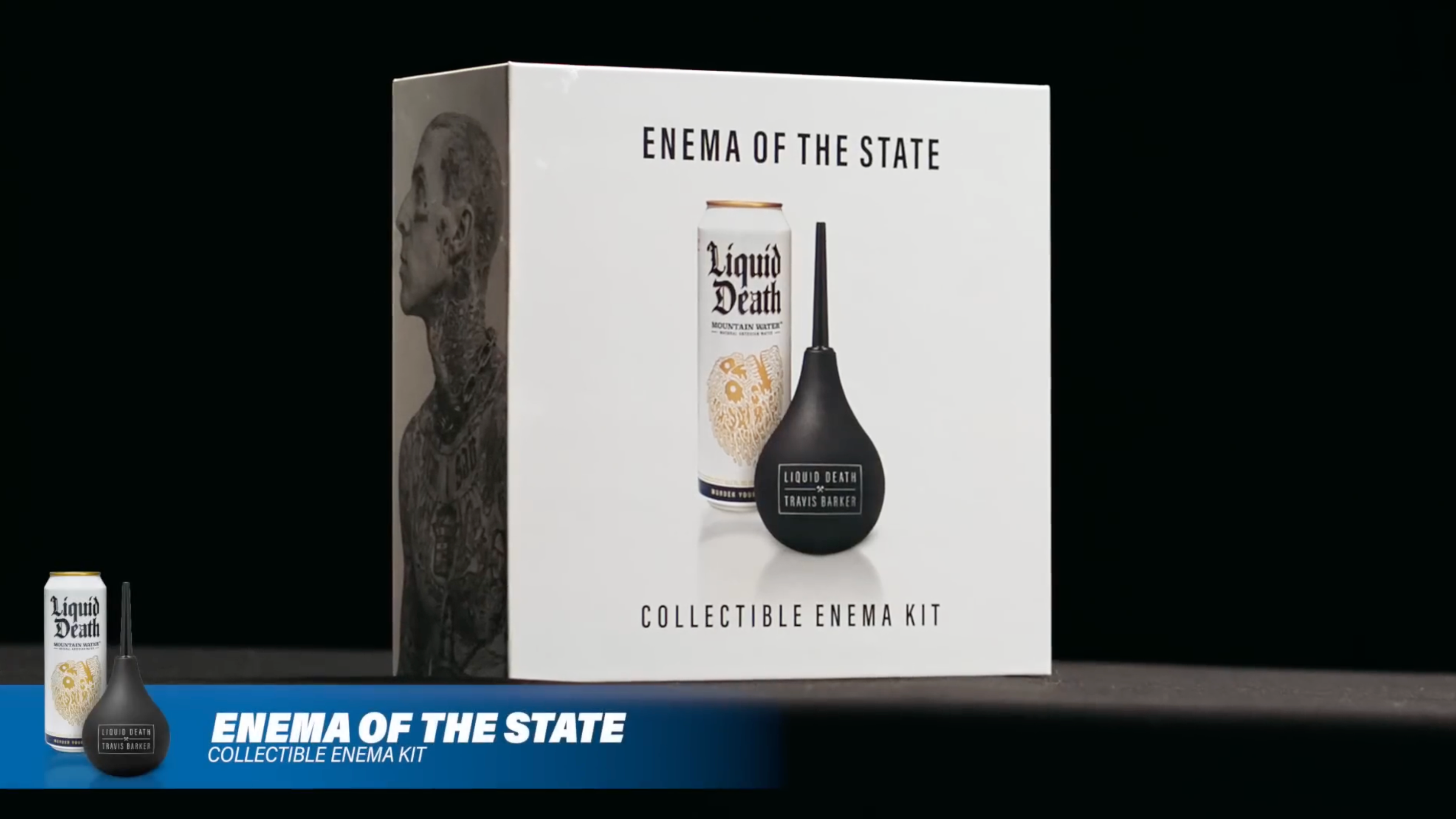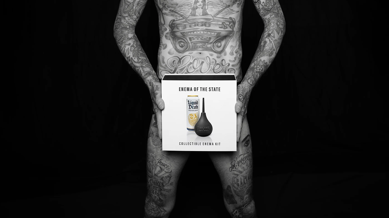 Every celebrity has their wellness secrets. Blink 182’s Travis Barker stays on culture’s bleeding edge by putting Liquid Death where the sun doesn’t shine. With renewed inner confidence, Travis does rock star things like go on world tours, marry a Kardashian, and play drums in the delivery room while his son is being born. Enema of the State Kits also propelled Liquid Death to new heights selling clean out in only four hours.