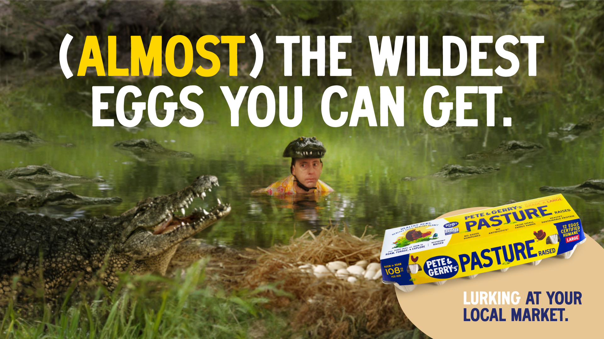 Pete & Gerry’s Pasture Raised hens thrive in actual pastures, free to roam in the sunshine and eat bugs to their heart's content—the way nature intended. To reinforce this simple truth and differentiator, we dropped the all-too-familiar confusing claims in the egg category and positioned Pete & Gerry’s as almost the wildest eggs you can get. In fact, to get a wilder egg, you’d have to outrun an alligator. Or an ostrich. Honestly, if you want a dozen? Both.